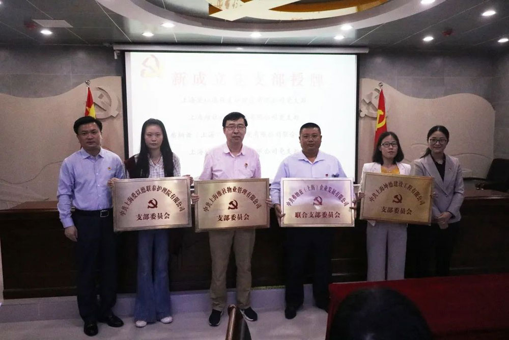 2020年5月28日宝山区顾村镇党委副书记王毓铭,镇总工会主席、综合党委副书记杨洁为新成立的上海头号玩家官网登录入口建设工程有限公司党支部进行授牌。